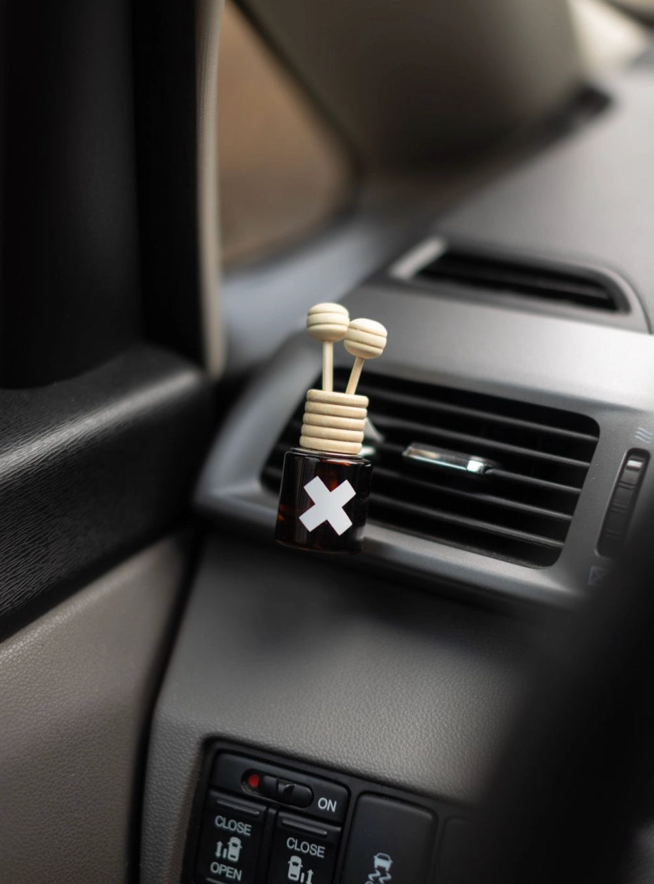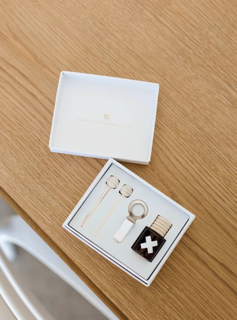 This car diffuser box contains our classic amber x glass diffuser prefilled with oil, wooden diffuser lid, metal vent clip, two wooden reeds, & one instruction sheet.